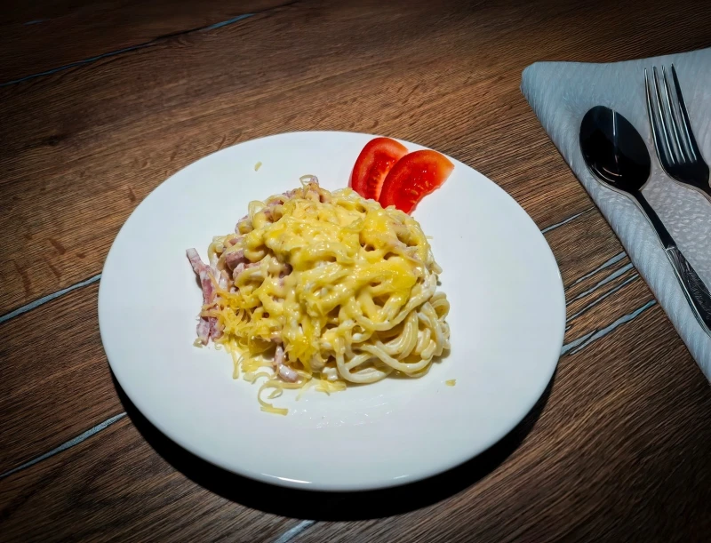 Паста «Карбонара» с ветчиной — это аппетитное и сытное блюдо итальянской кухни, адаптированное под доступные ингредиенты. В отличие от классического рецепта (с панчеттой и без сливок), здесь используется ветчина, а сливочный компонент придаёт соусу особую нежность и мягкость.