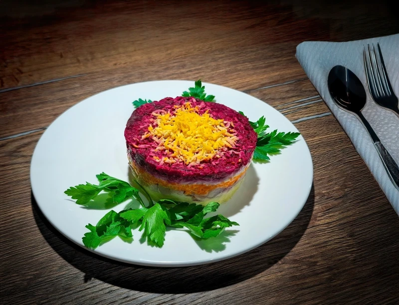 «Сельдь под шубой» — культовый салат русской и советской кухни, неизменный атрибут праздничных застолий. Это изысканное сочетание солёной нежности рыбы и бархатистой сладости отварных овощей, скреплённых лёгкой майонезной вуалью.